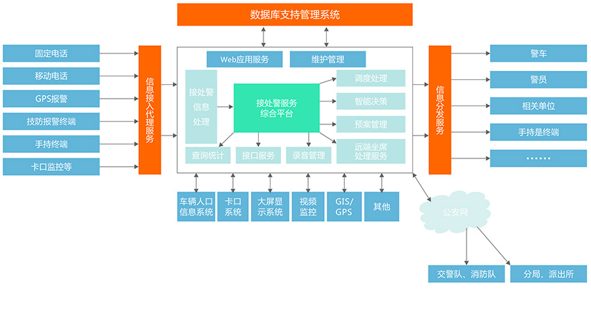 系統(tǒng)以計算機網(wǎng)絡系統(tǒng)為基礎,以有線和無線系統(tǒng)通信系統(tǒng)為紐帶,以接處警應用系統(tǒng)為核心,集成了GIS地理信息系統(tǒng)、通訊調(diào)度子系統(tǒng)、數(shù)字錄音錄時子系統(tǒng)、首長指揮子系統(tǒng)、輔助決策子系統(tǒng)、數(shù)據(jù)管理子系統(tǒng)、技術防范報警子系統(tǒng)、大屏幕顯示子系統(tǒng)、圖像監(jiān)控子系統(tǒng)、GPS衛(wèi)星定位系統(tǒng)、大型數(shù)據(jù)庫系統(tǒng)等,體現(xiàn)了高科技與公安業(yè)務的完美結合,同時也充分考慮了擴展性、維護性以及適用性。