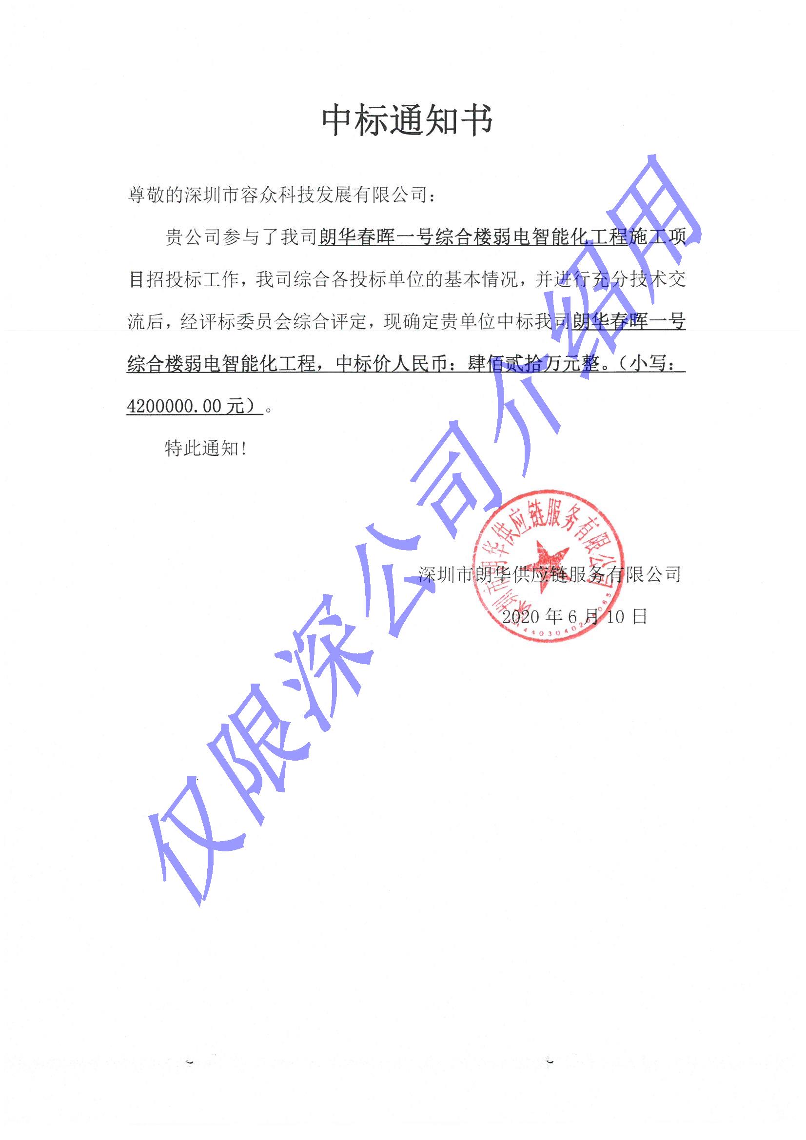 喜報:我公司以4200000.00元中標《朗華春暉一號綜合樓弱電智能化工程施工項目》