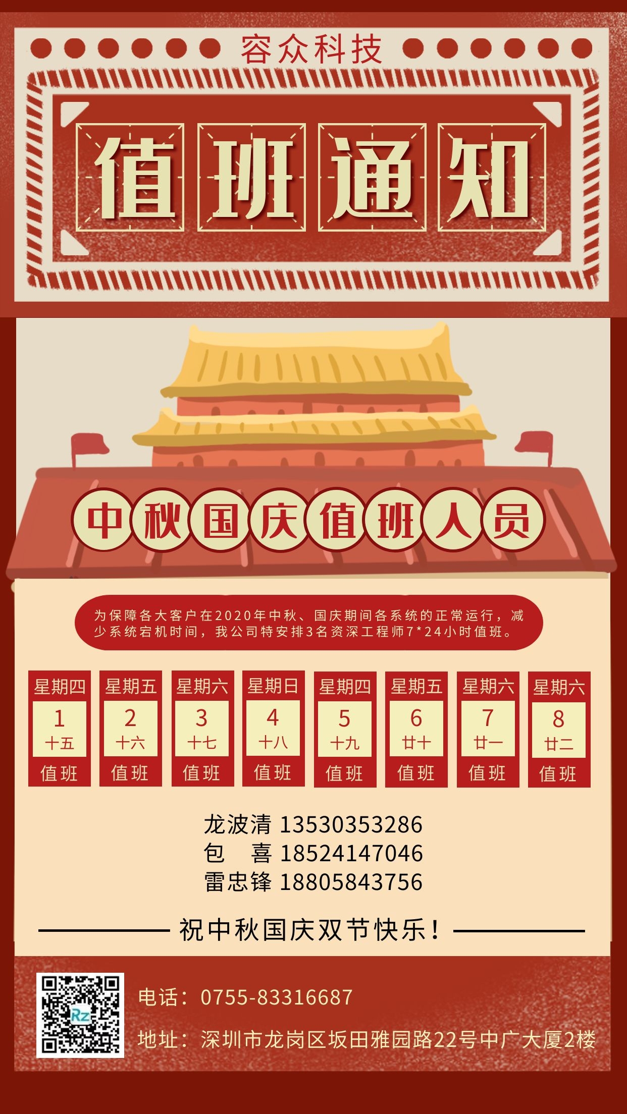 容眾科技 | 中秋國(guó)慶值班表